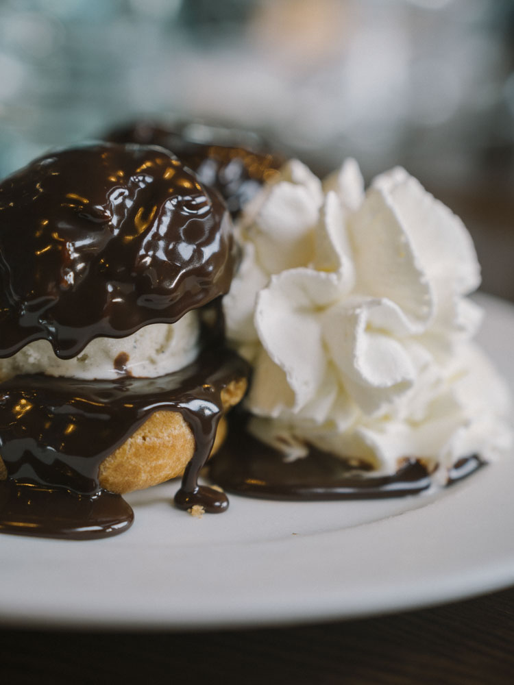 Profiteroles, glace vanille, chocolat chaud